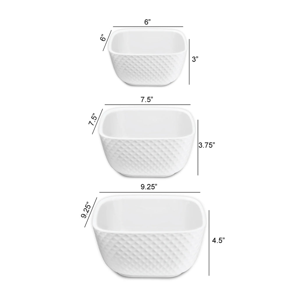 The Le Regalo 3 Piece Stoneware Square Bowl Set is a must-have addition to any kitchen. Featuring honeycomb design bowls, this set includes three bowls with capacities of 128 fl oz, 74 fl oz, and 36 fl oz, providing plenty of space for all your needs. These stoneware prep and serving bowls are dishwasher safe bowl set, oven-safe, and freezer-safe, making them the ultimate multipurpose kitchen accessory. Whether you’re mixing ingredients, baking a dish, or serving up a treat, these bowls are up to the task. Perfect for any home cook or entertainer.