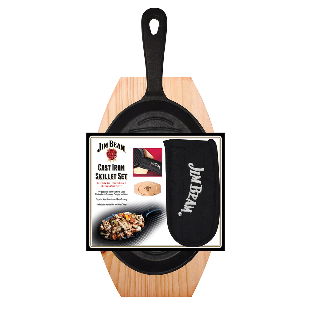 The Jim Beam Cast Iron Skillet Set includes a top-quality cast iron skillet, a comfortable Jim Beam embroidered handle mitt, and a wood trivet to protect your tabletops. This 3-piece cast iron cookware set is pre-seasoned for optimal performance and superior heat retention, ensuring evenly cooked meals every time. Whether you want to fry, grill, sauté, or bake, this versatile skillet works great on the stovetop, grill, and even the oven—making it perfect for grill, bake, fry, & sauté in one pan. The long-lasting, high-quality cast iron set guarantees durability and performance for years.