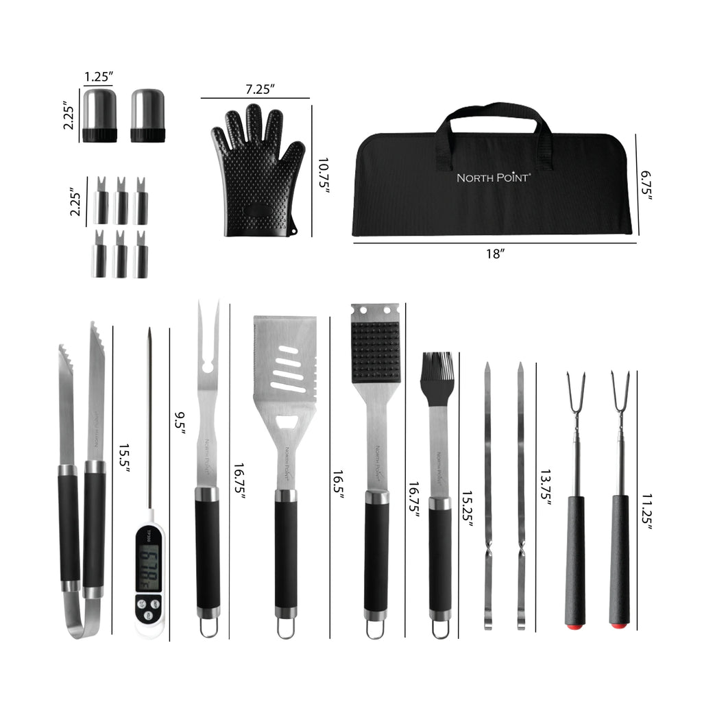 The North Point 20 Piece BBQ Tool Set and Carry Case is the ultimate grilling companion for any barbecue enthusiast. Made with heavy-duty stainless steel construction, this 20 piece BBQ tool set includes everything you need to grill like a pro. The set features easy-grip handles for maximum comfort and control while cooking, and the telescopic marshmallow fork is perfect for roasting marshmallows over the fire. The heat-resistant silicone mitt ensures your hands stay safe while handling hot items on the grill. With a convenient carry bag for storage and portability, you can take this complete BBQ tool set wherever you go. From a grill brush to skewers to a thermometer, these stainless steel BBQ tools have it all for the perfect barbecue experience.