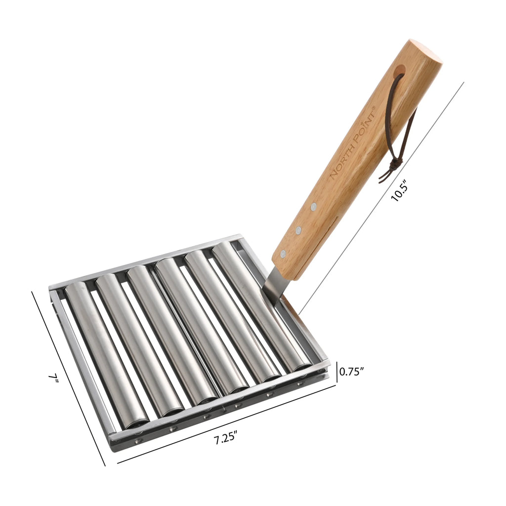 The North Point Hot Dog Roller is a must-have for any hot dog enthusiast. Made with heavy-duty stainless-steel construction, this roller is durable and built to last. The long wooden detachable handle locks in for easy lifting or rolling, making it convenient to use. With the ability to cook up to 5 hotdogs at a time, this 5-slot hot dog roller allows you to grill hot dogs efficiently and feed a crowd. Upgrade your grilling game with this exceptional hot dog grill accessory today!