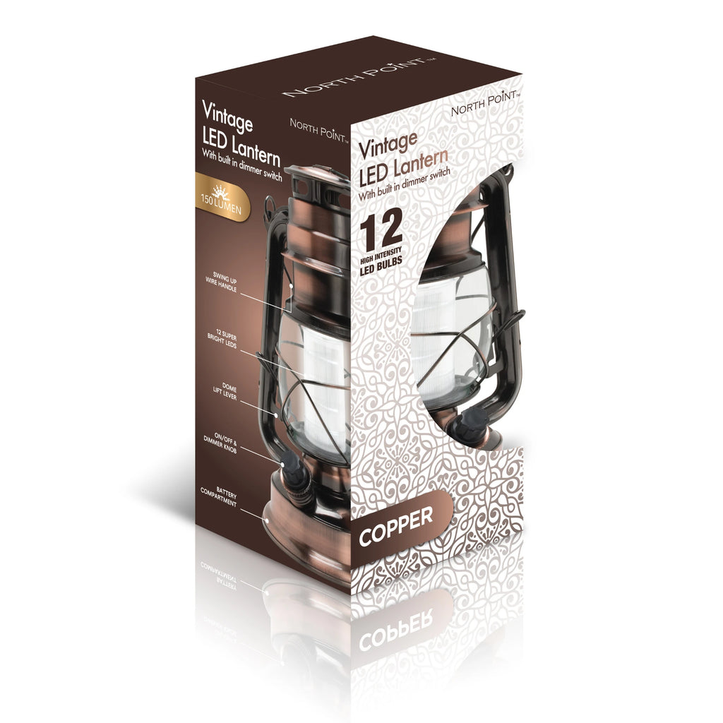 Light up the dark in style with the North Point Vintage LED Lantern with Built-in Dimmer Switch – Copper. This LED lantern with dimmer switch combines authentic vintage styling with modern performance, offering the best of both worlds. With a retro style lantern design, it looks great on any table setting, shelf, or as a hanging light source. The copper finish adds an elegant touch, making it a copper lantern with LED light that’s perfect for any outdoor adventure. Featuring a retro-styled handle, you can easily take this lantern with you for camping, barbecues, picnics, and beach trips. It's an outstanding piece for any setting.