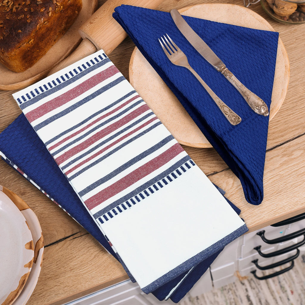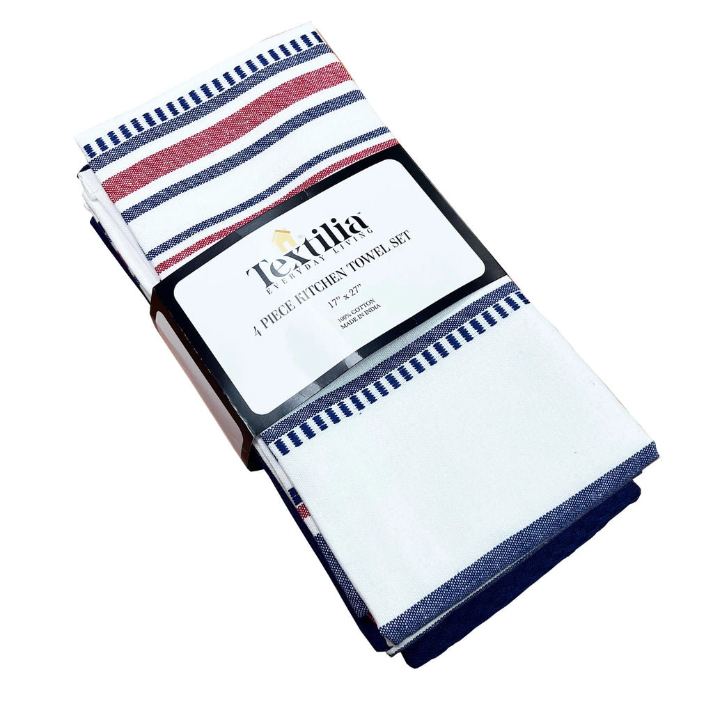 The Textilia 4 Piece Kitchen Towel Set is a must-have for any home cook or kitchen enthusiast. Made from 100% cotton, this kitchen essentials towel set includes two solid blue towels and two striped towels in red, white, and blue. The large towels come equipped with hanging loops for easy storage and accessibility. Not only are these towels stylish and durable, but they are also highly functional, serving as soft and absorbent dish towels for wiping up spills, drying dishes, and handling any kitchen task with ease. Designed as quick-dry kitchen towels with loops, they are an exceptional addition to any kitchen.